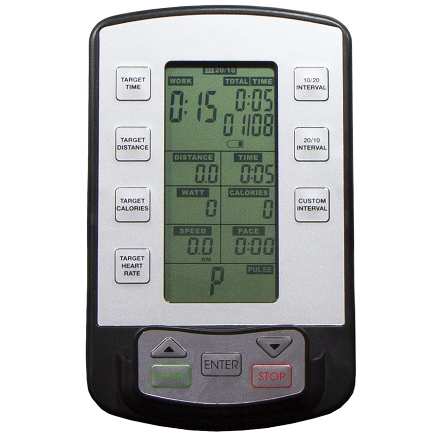 Показатели консоли: время, скорость, расстояние, калории, пульс, темп, Ватты, интервал (10/20), интервал (20/10), интервал пользовательский, целевое время, целевое расстояние, целевые калории, целевая частота пульса, уровень сопротивления.