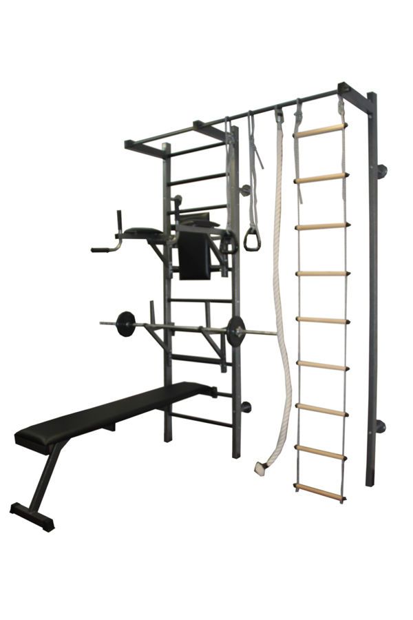 Комплектация: Шведская стенка с дополнительной стойкой, перекладина, брусья с подлокотниками и спинкой, скамья для пресса горизонтальная, упоры для штанги, кольца гимнастические, канат, веревочная лестница