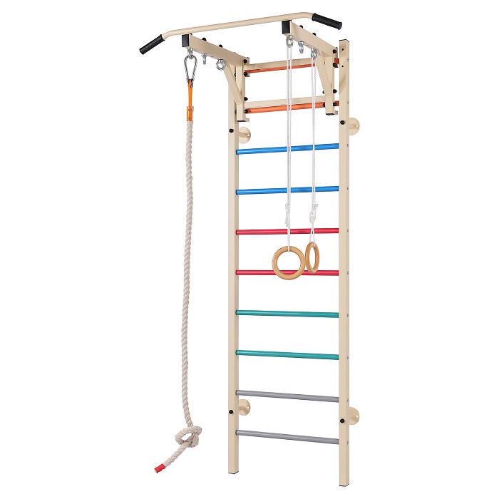 Занятия спортом превратятся для детей в увлекательное приключение, если в доме будет шведская стенка RS-T13 бежевого цвета с цветными перекладинами. Эта модель состоит из любимых детских снаряжений: каната, турника и колец, которые превратят скучные занятия спортом в интересные игры.