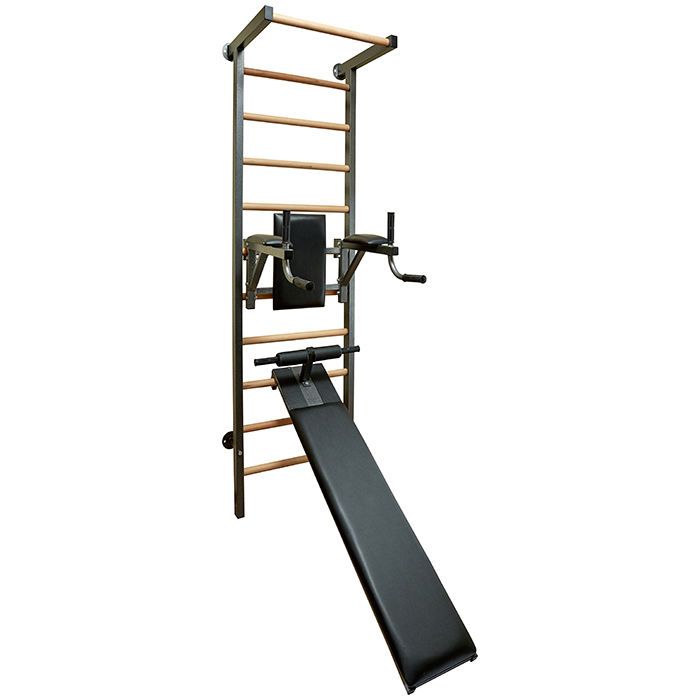 Комплектация: шведская стенка, навесной турник, брусья с подлокотниками и спинкой, скамейка для пресса с упорами