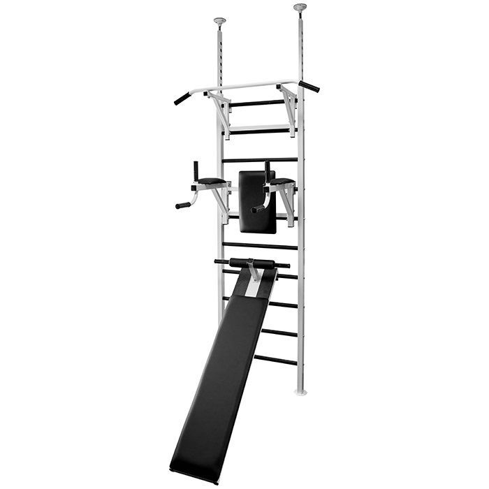Комплектация: шведская стенка + турник навесной + брусья с подлокотниками и спинкой, скамья для пресса с упорами