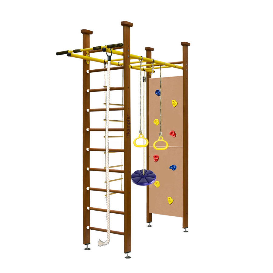 Домашний спортивный комплекс Kampfer Magic Trick. Конструкция выполнена из натурального дерева стойки и ступени, все края деталей немного скруглены обеспечивая большую безопасность для ребенка. Перекладины для навесного оборудования -металлические.