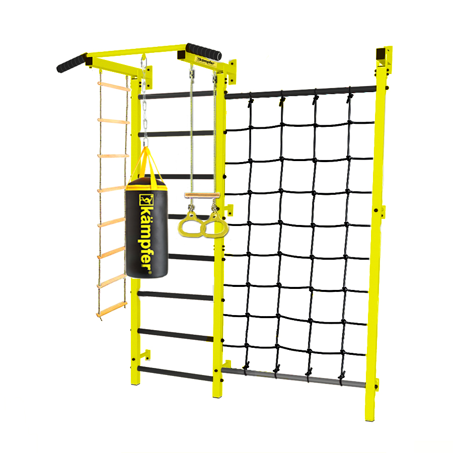 Крепкий металлический турник выдерживает нагрузку до 120 кг, подходит как детям так и взрослым. Навесное оборудование Kampfer на прочных тросах выдерживает нагрузку до 100 кг. В дополнении к основным аксессуарам в комплектации к Kampfer Zeus идет канатный лаз - это прочная сетка шириной 82 см из крепкого шнура выдерживает нагрузку до 100 кг. Стойка с сеткой Kampfer Zeus значительно расширяет игровое пространство детской комнаты и позволяет разнообразить функциональность классической шведской стенки Kampfer.