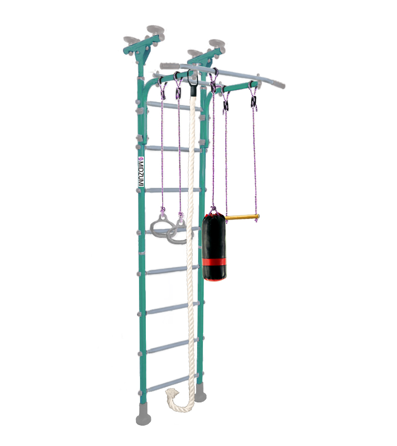 Комплектация: основа - металлическая шведская стенка с турником, боксерский мешок, гимнастические кольца, трапеция, канат