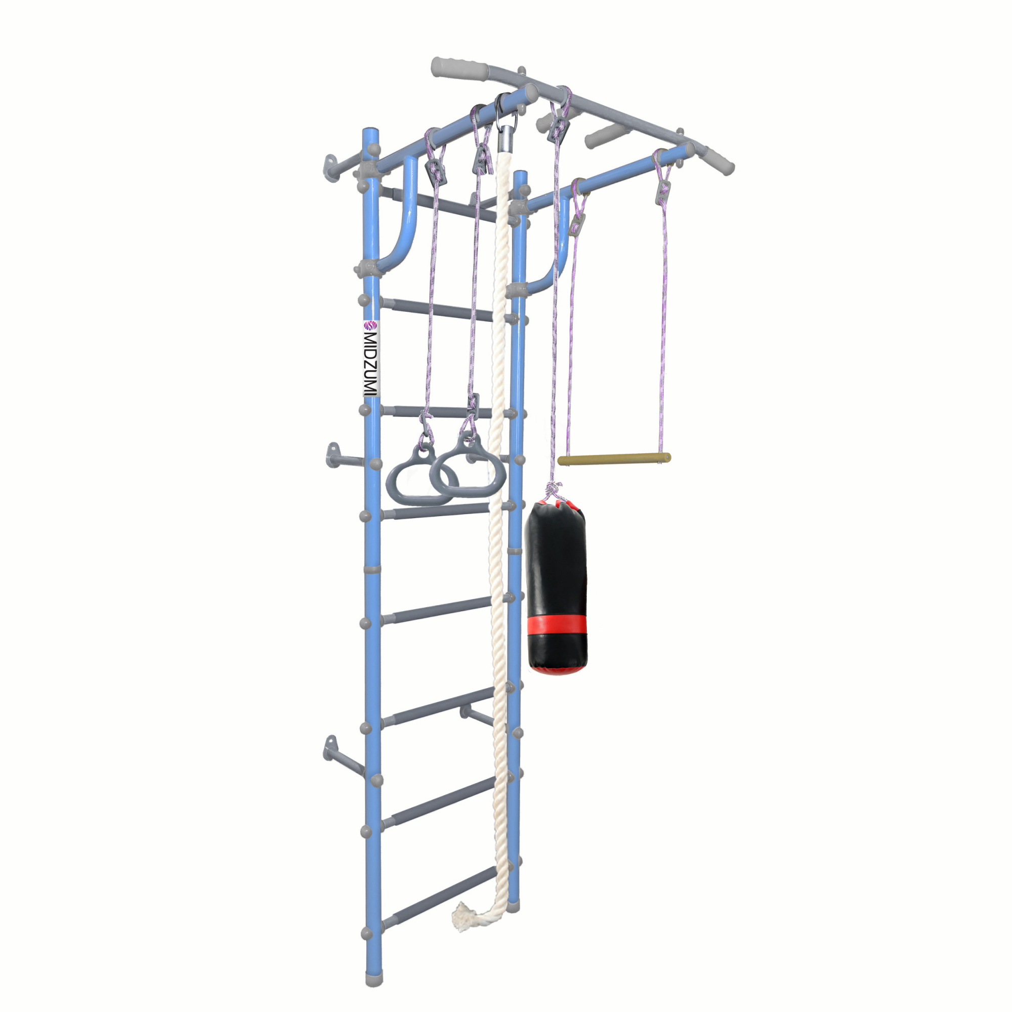 Комплектация: основа - металлическая шведская стенка с турником, боксерский мешок, гимнастические кольца, канат, трапеция