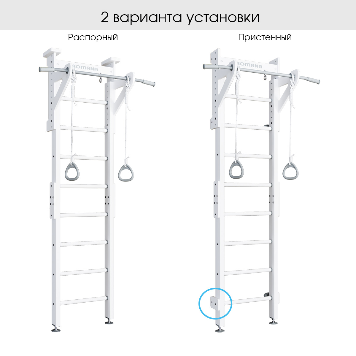 Спортивный комплекс ROMANA Eco1 может закрепляться двумя способами, к стене и враспор к потолку. В комплексе Eco1 предусмотрен фиксированный турник, а также кольца, которые можно разместить на нем.