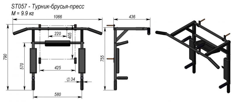 Турник-брусья-навес для пресса со спинкой V-SPORT - Цельносварное высокопрочное изделие. Крепление на стену в двух точках. Для ST057 два положения - турник или брусья-пресс повернув изделие на 90°. Компактная, универсальная конструкция для тренировок со своим весом на классическое подтягивание, отжимание и упражнений на пресс с упором на локти. Основа спинки и упоров - многослойная фанера (15 мм), в качестве наполнителя используется поролон устойчивый к усадке покрытый высококачественной искусственной кожей различных цветов.