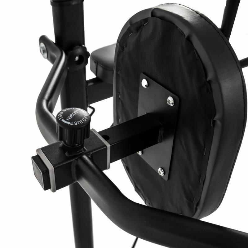 Вынесенные вперед на значительное расстояние брусья не стесняют спортсмена в выборе положения для выполнения отжиманий. Их удобно будет делать, как находясь лицом к тренажеру, так и спиной к нему.