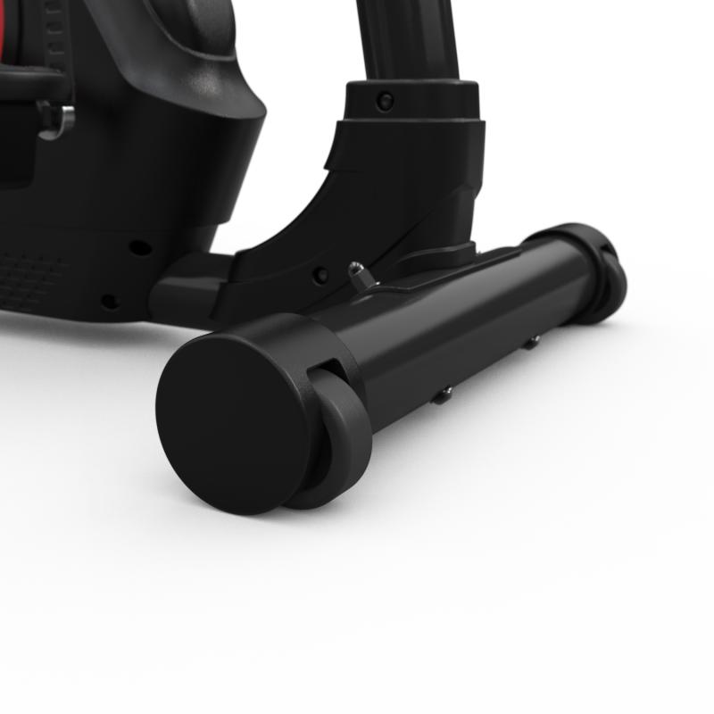 Для удобства тренировки на поручнях установлены сенсорные датчики пульса, а на консоли есть подставка для планшета. В конструкции предусмотрены компенсаторы неровностей пола и транспортировочные ролики, которые облегчают перемещение тренажера.