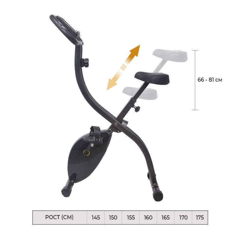 Широкое сиденье регулируется по высоте на 7 уровней в диапазоне от 66 до 81 см. Данное свойство позволяет заниматься пользователям ростом от 145 до 175 см. Максимально доступный вес пользователя - до 110 кг.