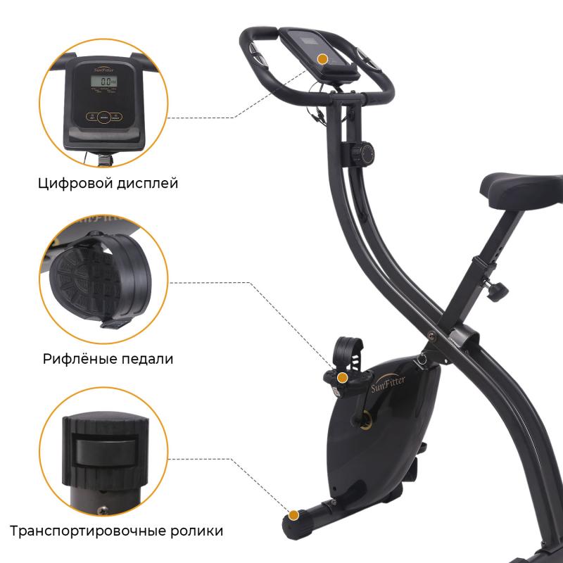 Отличительной чертой SUN FITTER является складная конструкция: в сложенном виде тренажёр занимает всего 17 см по длине. Транспортировочные ролики на передних ножках предусмотрены для лёгкого перемещения по дому. Компенсаторы неровности пола на задних ножках велотренажёра обеспечат комфортные тренировки в любом помещении.