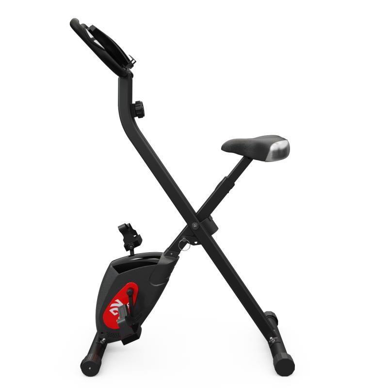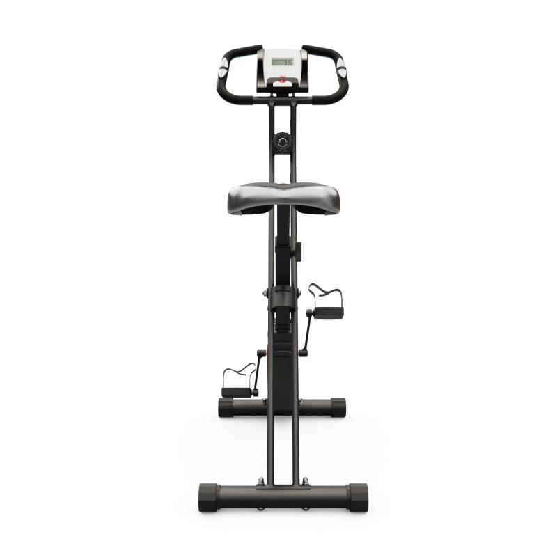 Конструкция велотренажера складная, что позволяет легко его хранить и транспортировать. Тренажер оборудован компенсаторами неровностей пола для стабилизации и карманом для хранения мелких предметов.