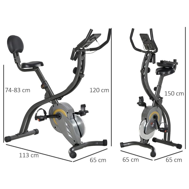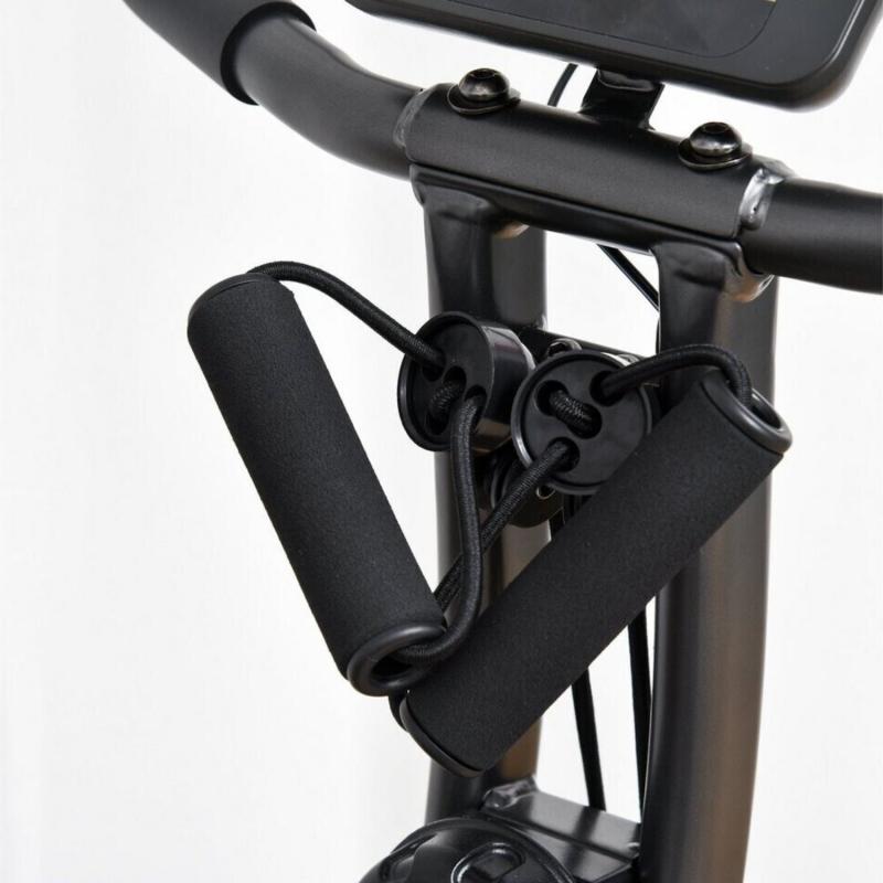 Для удобства пользователя велотренажер оснащен регулируемым по высоте сиденьем (5 уровней), передней опорной стойкой с 2 подвижными колесами для удобства транспортировки, педалями с регулируемыми ремешками и компенсаторами неровности пола. Велосипед удобно складывается и экономит место, а также имеет подставку под планшет.