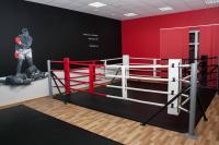 Комплектация ринга на упорах может быть как мобильной, так и стационарной: отличие состоит в способе крепления напольного покрытия. Напольное покрытие состоит из подложки (изолон 20-30 мм) и тентового покрывала изготовленного из специализированной антискользящей ткани немецкого производства.